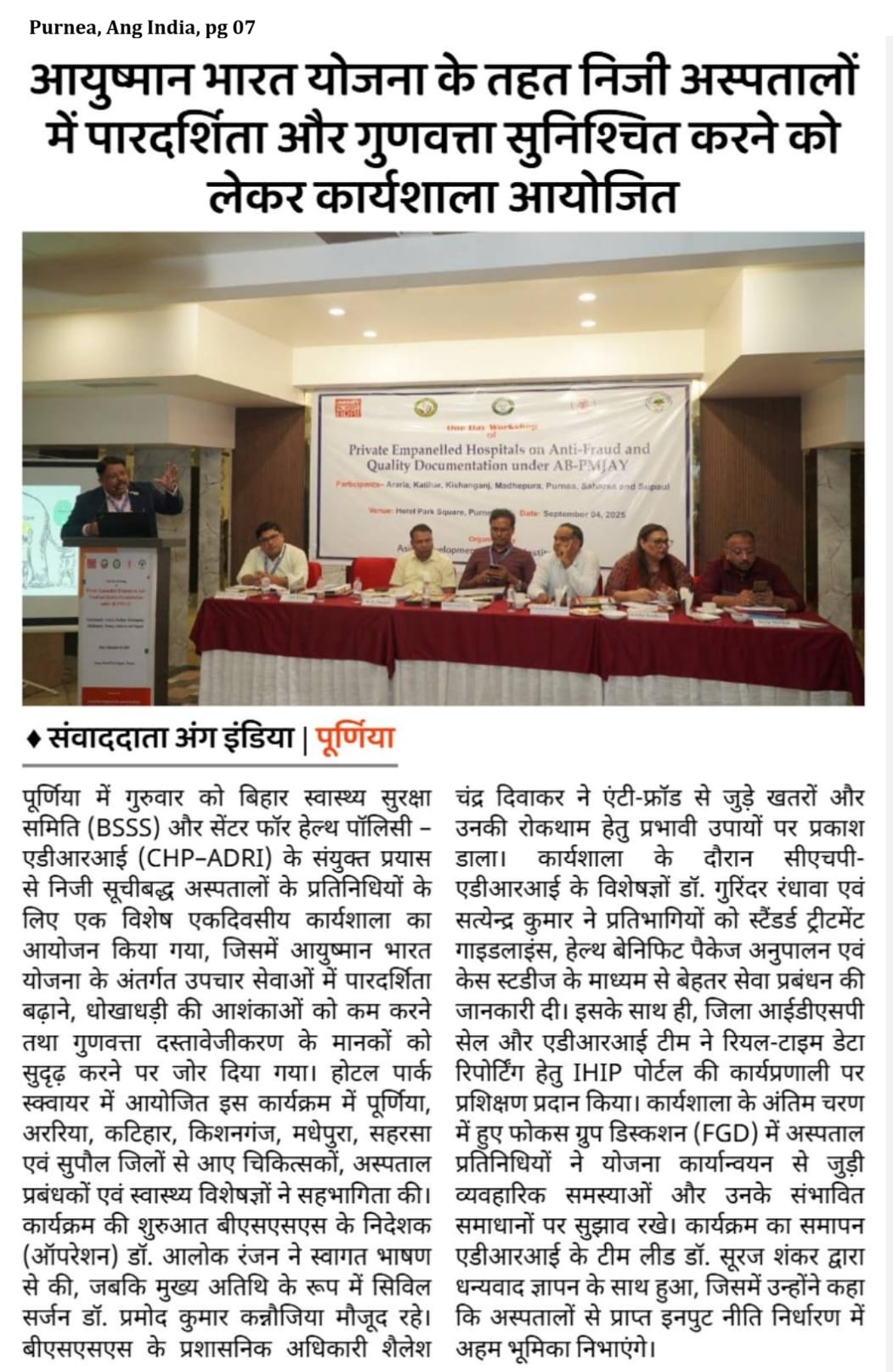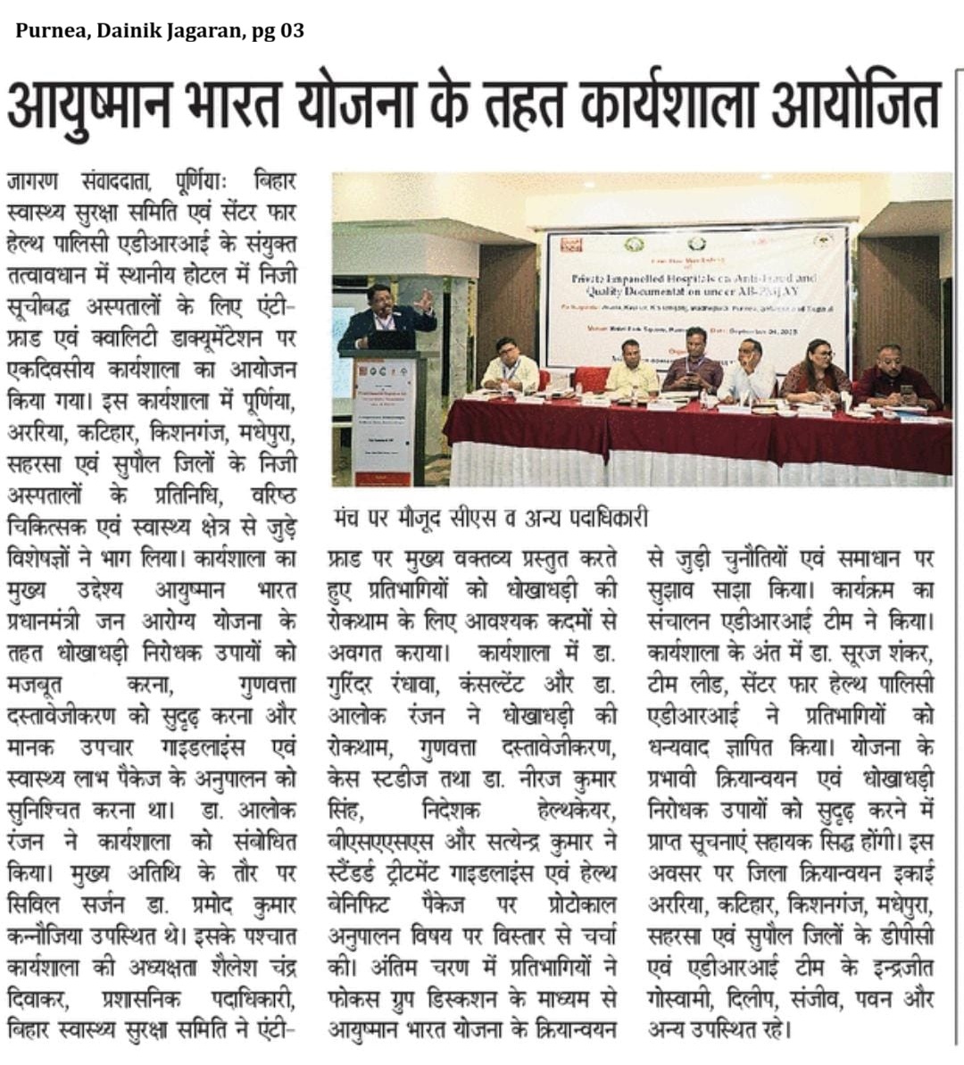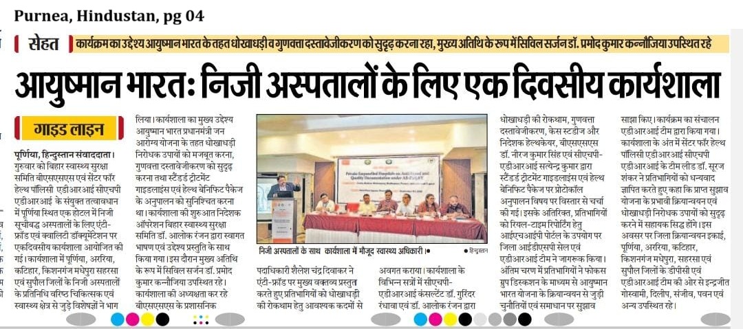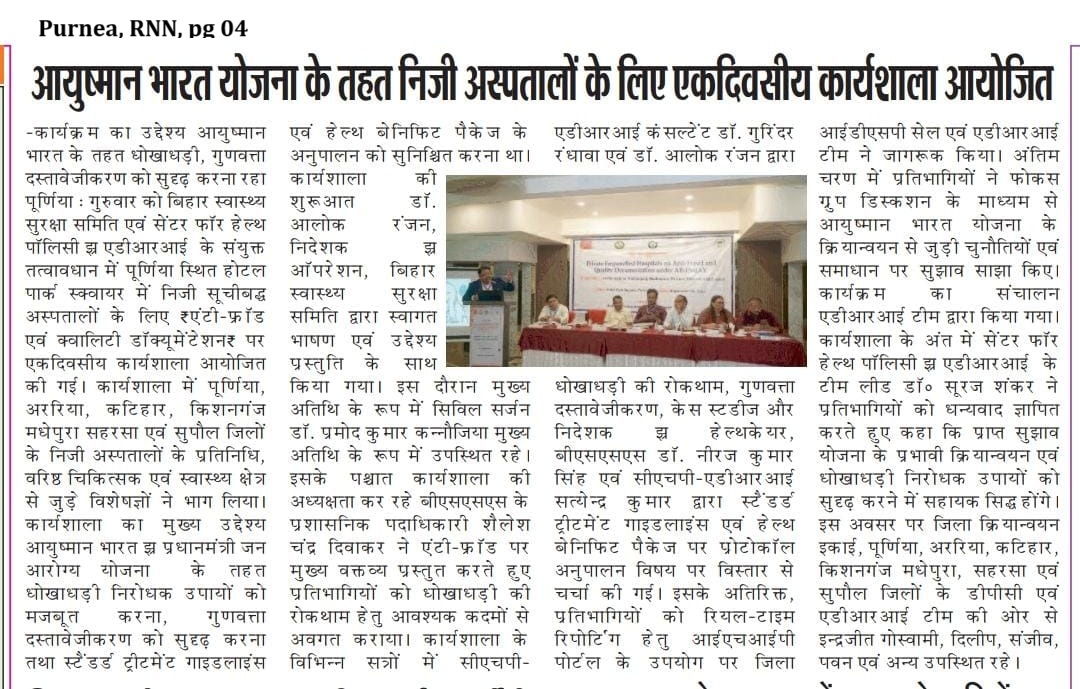 One Day Workshop of the Private empanelled hospitals on Anti-Fraud and Quality Documentation under AB-PMJAY: Participants: Purnea, Araria, Katihar, Kishanganj, Madhepura, Saharsa and Supaul. (CHP)